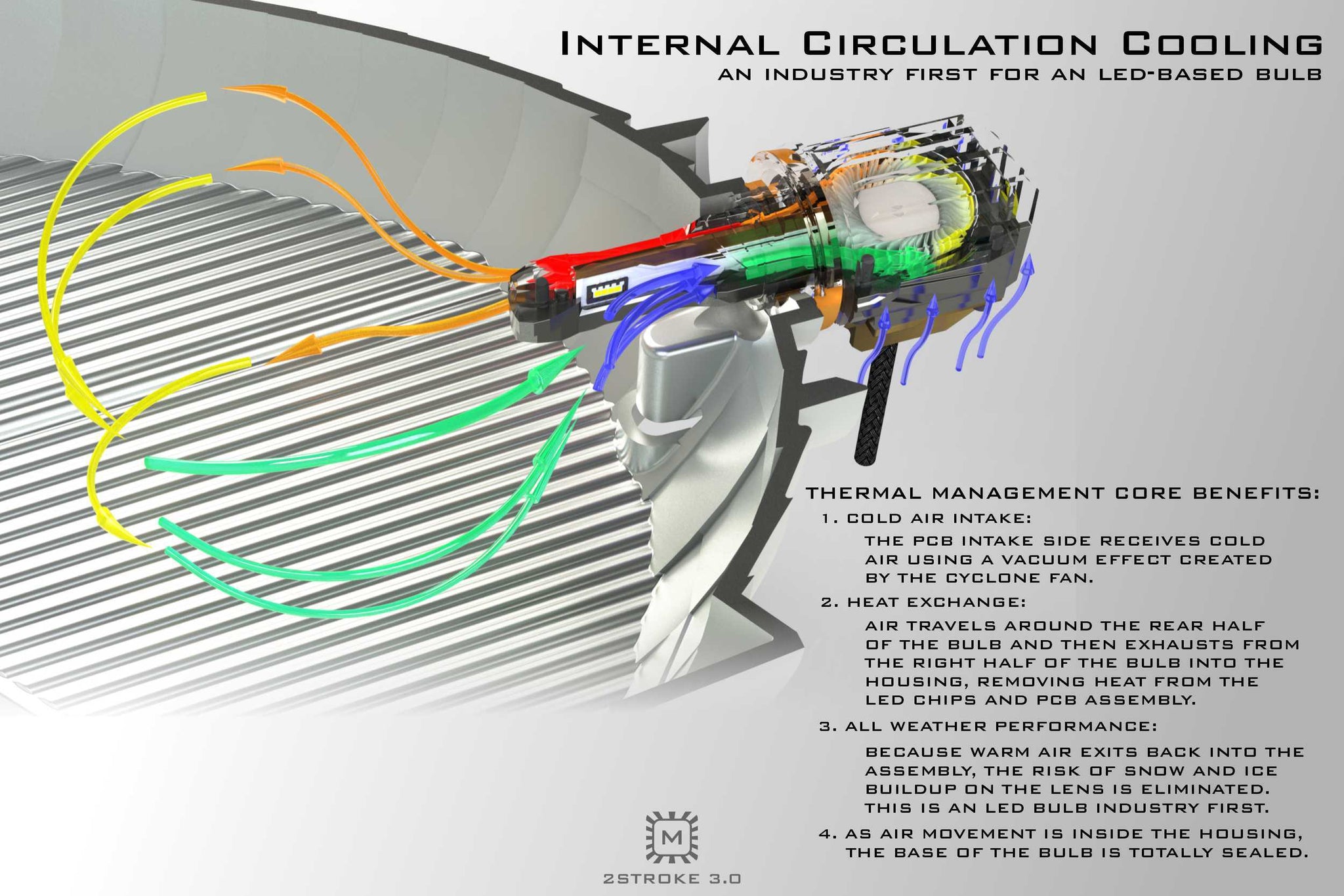 THERMAL MANAGEMENT: Once the bulb is installed, the high-speed fan contained within is completely sealed, making the 2Stroke 3.0 the first actively cooled LED bulb with a fan that's not susceptible to outside elements. Their unique internal circulation cooling system uses a 12,000-rpm cyclone fan to suck cool air into the body of the bulb and blow warm air out, back into the housing. On the intake side, cold air is sucked in past the sidewall of the PCB to exchange heat and is blown out the opposite side of the bulb. This effectively cools the bulb while warming the ambient temperature inside of the housing, increasing resistance to snow/ice buildup on the lens during the winter months. The cooling system on the 2Stroke 3.0 not only does it's job to protect the longevity of the bulb, but serves up a bad-weather benefit not found elsewhere. US Patent #11079090 (Click for Details)