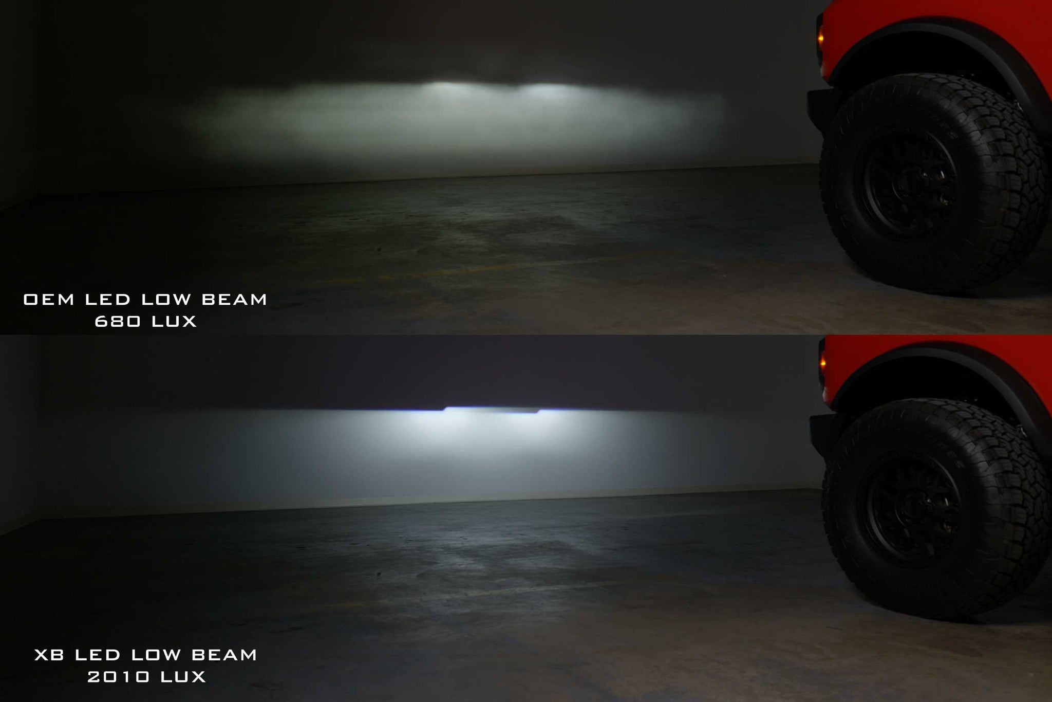 UNMATCHED VISIBILITY: The XRGB headlights make use of high output Bi-LED projectors that produce a meaningful amount of added intensity and road coverage compared to the stock Bronco LED headlights. Max intensity for low beam mode is 150% up over stock, and the high beam is 86% brighter than stock. that's more than twice as much output in low beam mode, and almost double in high beam! While that's impressive, the distribution of light is also more optimal too--with much more width in the beam pattern and increased high beam coverage too.