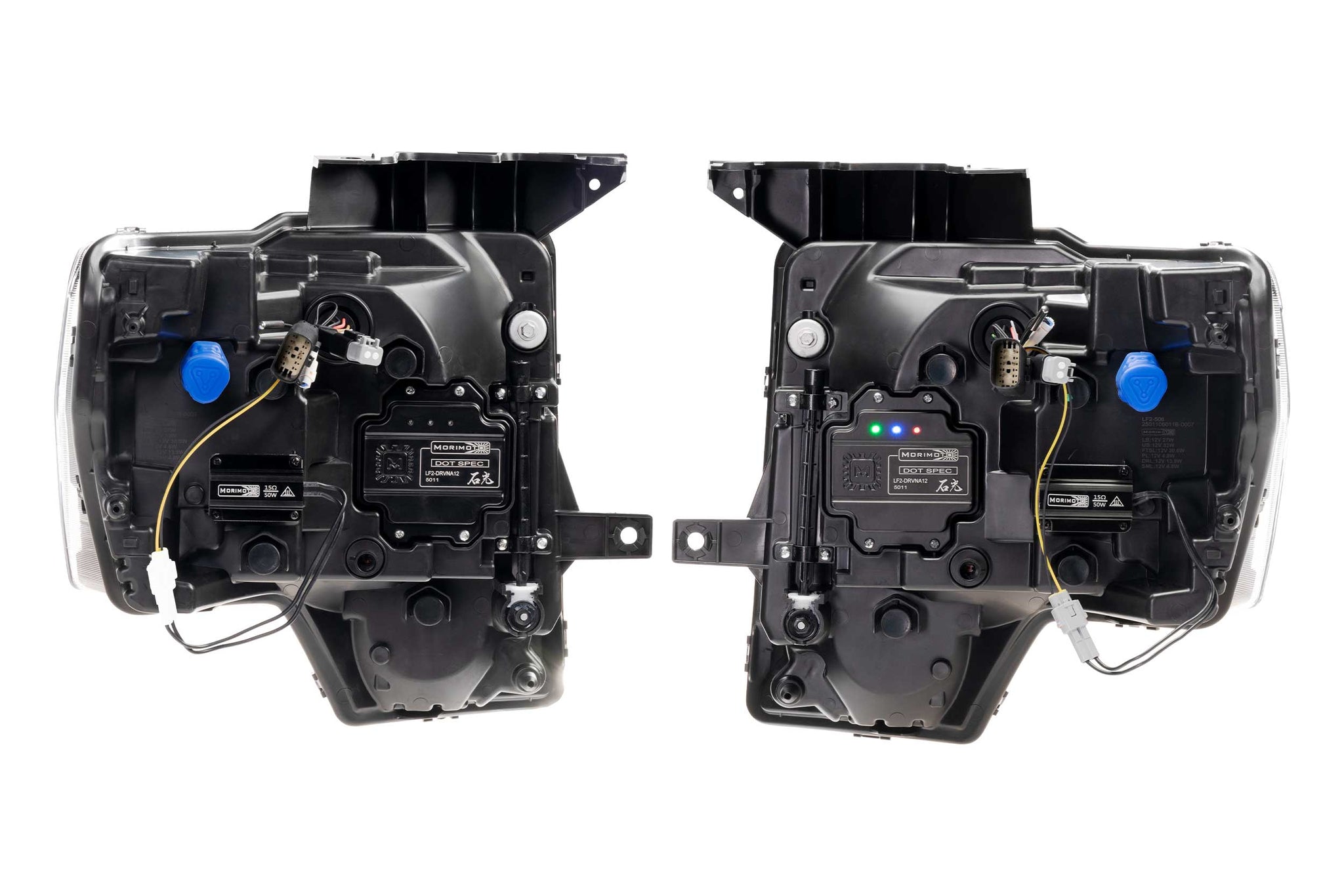 On Road: The Morimoto XB Evo Headlights are DOT compliant with all FVMSS108 regulations for on-road use in the USA*. Their projector optics are so capable and efficient that their LEDs are only driven at about 50% of their full potential intensity to avoid exceeding limitations set by compliance. The vertical aim is fully adjustable within +/- 6 degrees for a perfect alignment on any F-150, even with a lift. The system was designed in California by Morimoto's lead optical engineer, Yoshi Ishida, to deliver maximum visibility, comfort, and safety, and that it does. *Note: Due to the separate adjuster on the auxiliary high beam pods, this feature is not compliant for on-road use.