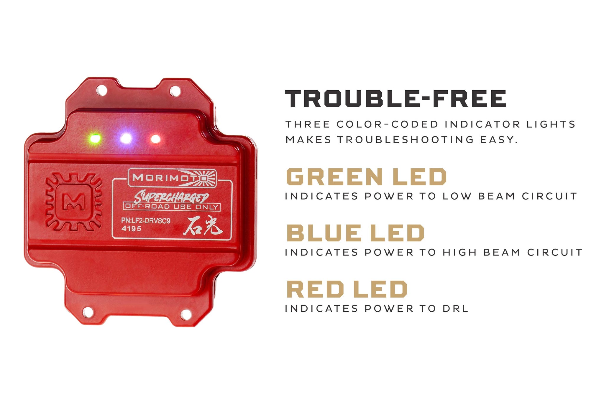 Trouble-Free: Three color-coded indicator lights* on the back of the LED drivers not only help to assure you that everything is working properly, but if in the rare case that something isn't, also help you identify problems with minimal troubleshooting and/or disassembly. *The Red LED confirms power to the DRL, the green LED confirms power to the low beam circuit, and the blue LED to the high beam circuit.