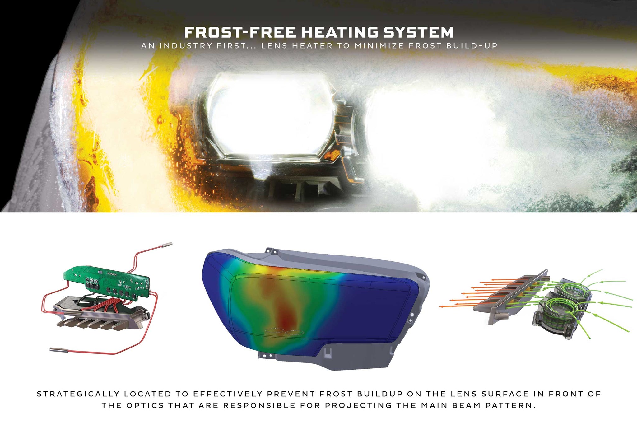 Frost-Free System: Our patent-pending heating system warms the surface temperature of the headlight lens to minimize frost buildup when driving through wet and snowy conditions in the wintertime. When the temperature drops below 5C/41F, the system is enabled to operate on your command by flashing the high beams four times. The lights will confirm that the heating function is operating by flashing the high beams twice. From there, it will automatically maintain temps within the headlight housing to mitigate frost buildup on the lens. A cold-climate game changer, this feature ensures the output of your XB Evo headlights will remain strong when you need it most.