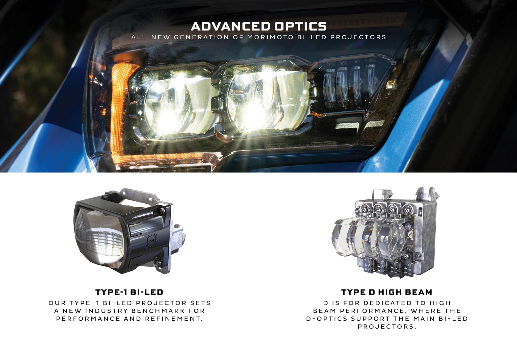 Maximum Performance: Thanks to an all-new generation of Morimoto Bi-LED projectors, the XB Evo headlights will meet and exceed the highest standards for headlight performance that are set by the Insurance Institute for Highway Safety... which is a tough mark even for most modern luxury automakers. Here, the Tacoma Evo headlight utilizes dual Bi-LED projectors to deliver unmatched light output, with an incredibly bright and wide low beam, and a high beam that destroys darkness. In high beam mode, dedicated D-Optics add even more intensity and coverage. All optics are powered by the latest OE-grade automotive LEDs from Nichia in Japan.